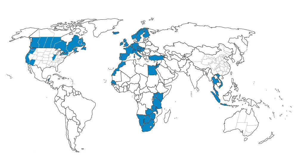 Ägypten, Botswana, Kenia, Malawi, Marokko, Namibia, Ruanda, Sambia, Senegal, Simbabwe, Südafrika, Tansania, Uganda